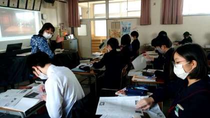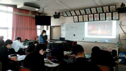 3年生音楽科で、音楽史のプリントが配られました。日本や西洋の音楽史がまとめられています。スクリーンには能楽の映像が映されていますね。来週の学年末テストで出題されるとのこと。プリントを失くさないように気をつけましょう。