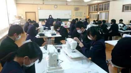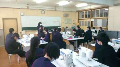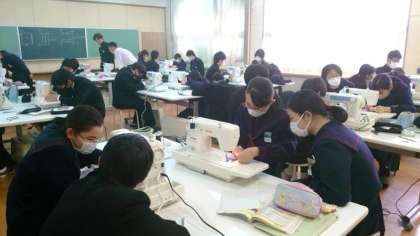 3年生家庭科でミシン操作の実技テストが行われています。折り目に沿ってまっすぐ縫えたか・端ギリギリまできちんと縫えたか・返し縫いは? などさまざまな評価項目があるようです。皆さん、互いに教え合いながらテストに臨んでいます。