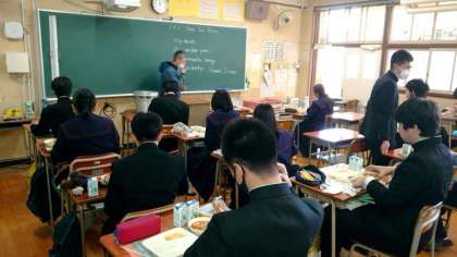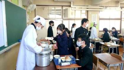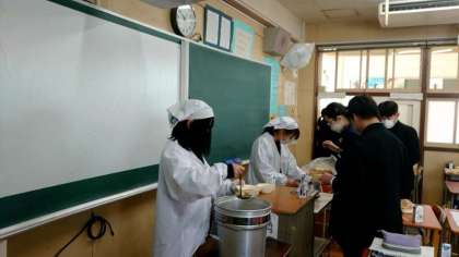 お昼休みのチャイムが鳴り、給食の準備が始まりました。今日は「豚と野菜のケチャップ煮・カリフラワーのピクルス・フルーツゼリー」の洋風献立。3年生の教室では配食が進みます。温かいケチャップ煮で身体を温めてくださいね。