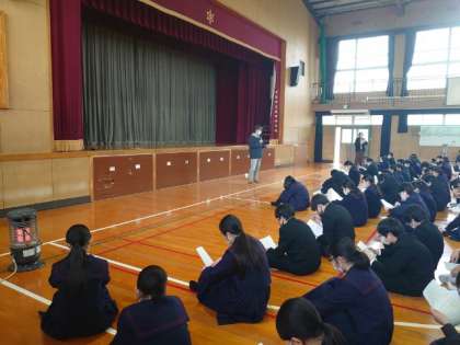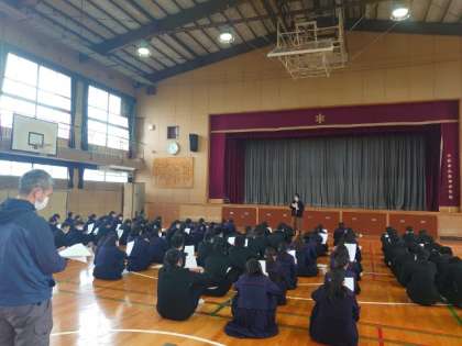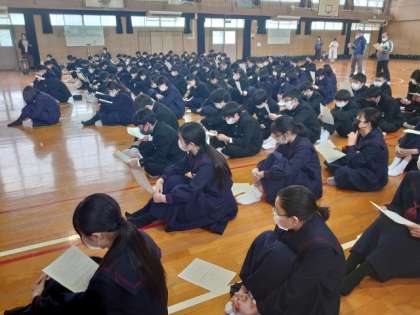 学年末テストを終えた3年生が体育館に集まってきました。明日の私立高校願書出願にむけて、説明や諸注意に耳を傾けます。明日はいつもの服装に加え、防寒着を必ず用意してくださいね。