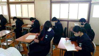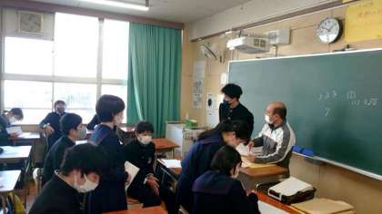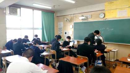 3年生数学の授業で学年末テストの結果が返ってきました。先生から配られた模範解答を見ながら答え合わせ中。結果についてクラスメイトと談笑するひとときが良いですね。