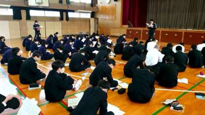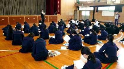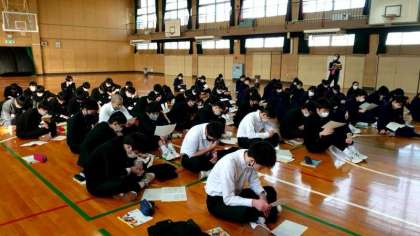 3年生の皆さんが体育館に集まっています。先週実施された保健体育科のテストを返却するとのこと。2クラスが入る教室が無いので、体育館での返却となりました。問題の解説後、解答用紙が返ってきます。結果が楽しみですね。