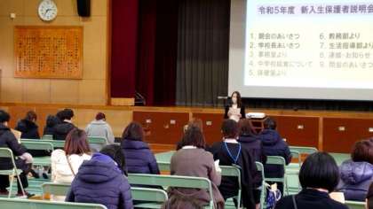 現在、体育館にて新入生保護者説明会が行われています。事務室から学校徴収金や口座振込みのお知らせを、給食担当から学校給食の説明がありました。何かご質問がありましたら、いつでも中学校まで連絡をお願いします。