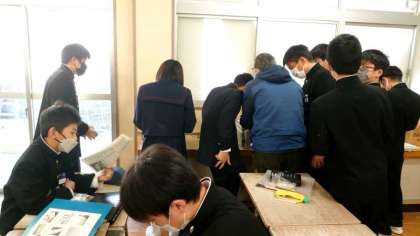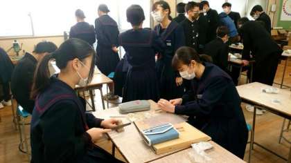 1年生美術科で木彫りのハンコを制作します。デザインがまとまり、今日は彫刻刀や電動糸ノコを使って、持ち手の部分を削ります。動物やキャラクターの形の持ち手が多い模様。指先をケガしないよう、気をつけてくださいね。