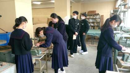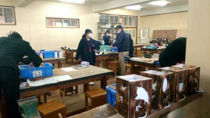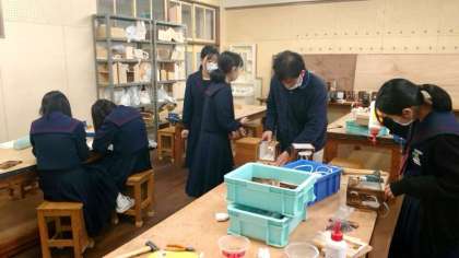 3年生技術科で製作している木製の電気スタンド。パネルに好きなデザインを彫り、焼き目をつけて仕上げます。お友だちとの会話を楽しみながら作業に励みます。ほっこりとした雰囲気が良いですね。
