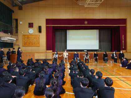 海外からの留学生8名をお迎えし、国際交流会が行われています。1年生の皆さんが柔道や書道のパフォーマンスを披露中。日本文化の一端を紹介しました。