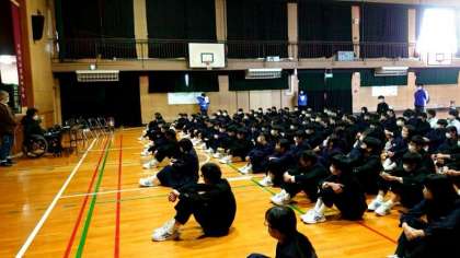 天王寺区社会福祉協議会の方々にご協力いただき、2年生で福祉体験学習が行われています。今日と金曜日の2回に分けて取り組む予定。今日は事故の後遺症で車イスでの生活を送る方からお話をお聞きします。