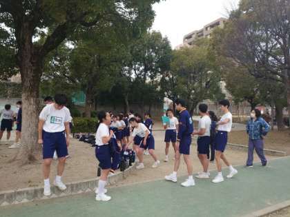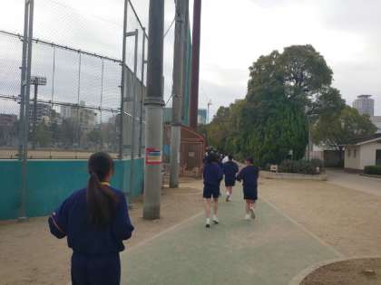 3年3、4組の皆さんが無事に完走しました。皆さん束の間の休憩をとっているところ。校内で計測したタイムを上回りましたか?
