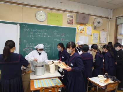 お昼のチャイムが鳴り、給食準備が始まりました。今日は「中華おこわ・卵スープ・キャベツのオイスター炒め」の中華メニュー。おこわはもち米を蒸したご飯。1年生の各教室では皆さん協力して配食をお手伝いしています。