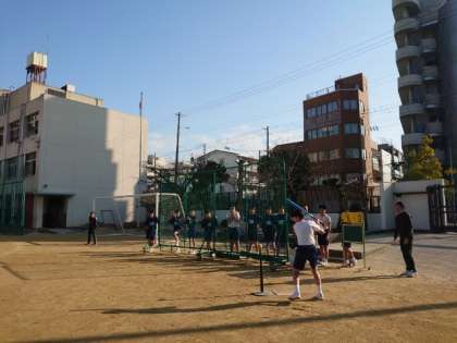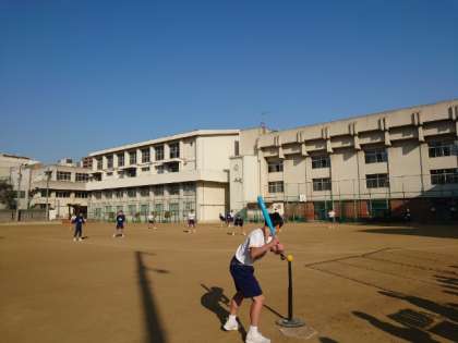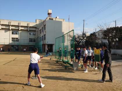 3年生体育の授業で男子の皆さんがティーボールを楽しんでいます。バッティングティーにボールをのせて、止まったボールを打つゲーム。クラス対抗戦で勝敗を競います。好プレー、珍プレーに歓声が上がります。