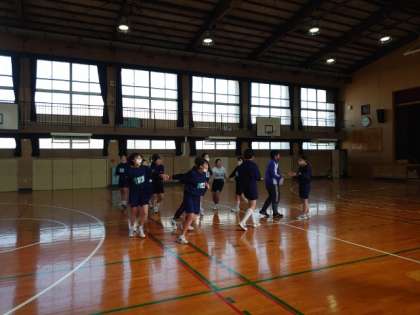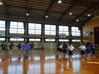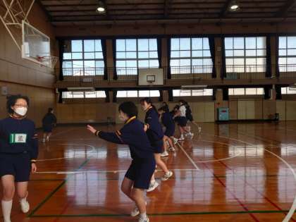 3年女子の皆さんは体育館で「手つなぎ鬼ごっこ」。逃げ回る鬼さんをみんなで追いかけます。笑い声と歓声が館内に響いています。皆さんとっても楽しそうですね。