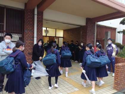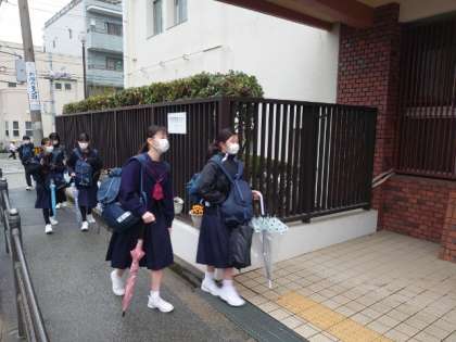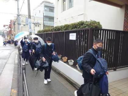 冷たい雨がしとしとと降る朝。3年生の皆さんは受験会場に無事到着していることでしょう。今日は2年生福祉体験学習の2回目。校内で車イスやアイマスク体験を行う予定です。