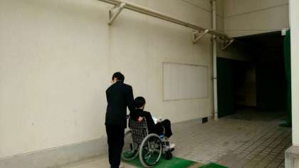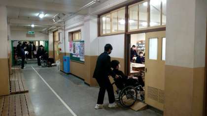 天王寺区社会福祉協議会の方々に来校いただき、2年生が車イス体験をさせていただいています。初めて車イスを操作する人も多いことと思います。皆さん、介助方法を学びましょう。
