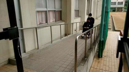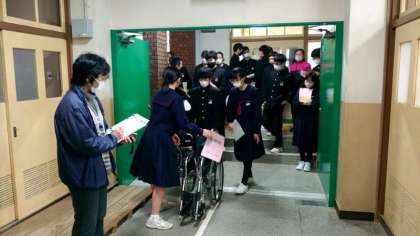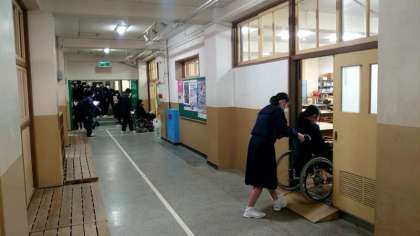 2年生の皆さんがペアになって、校内を車イスで巡ります。段差のある箇所やスロープなど、注意が必要なところでの操作方法を実体験。いざ操作してみると、難しさがよくわかりますね。