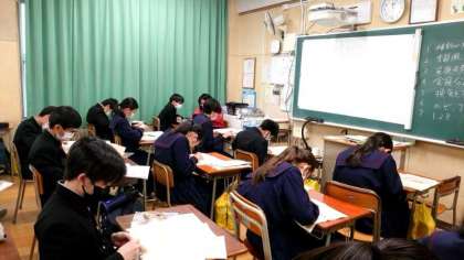1年生家庭科で布製のランチョンマットを制作します。マットの縁にはスウェーデン刺繍を施します。スクリーンには見本の刺繍が投影され、皆さん一所懸命針を縫い進めます。ゆったりとした穏やかな雰囲気が良いですね。