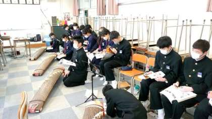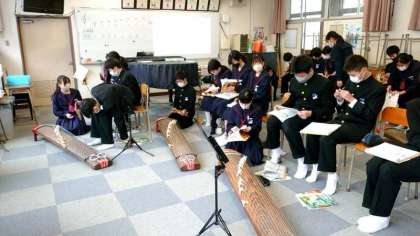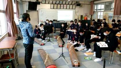 1年生音楽科で筝の演奏を教わります。実際に筝を弾く前にまずは調弦の仕方から。お筝の各弦に筝柱をセットし、筝柱を左右に動かして音を調律するとのこと。皆さん上手くできましたか?