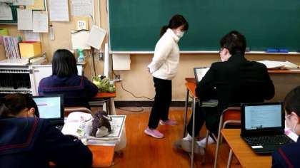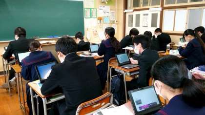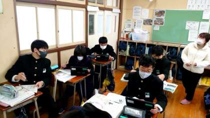3年生理科の授業で「地球温暖化と自然災害」について調べ学習を行っています。皆さん、タブレット端末を使ってネット検索中。海水面の上昇や山林火災など、温暖化が原因の1つと言われているものが多く発生していますね。