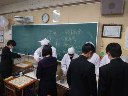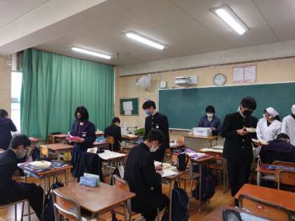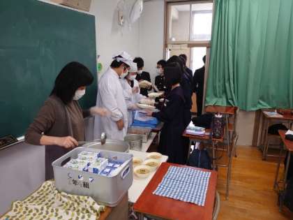 お昼休みのチャイムが鳴り、お待ちかねの給食の時間。2年生の教室では配食準備が進みます。今日は「赤魚の煮付け・高野豆腐と挽肉の炒り煮・お味噌汁」の和風献立。温かいお味噌汁をいただいて、午後からも頑張りましょう。
