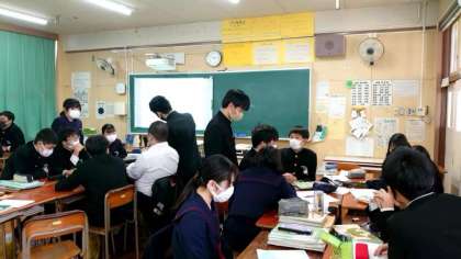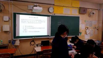 3年生数学の授業で「標本調査」についてディベートを行います。標本調査は全体の中から一部を取り出し、全体を推定する調査方法のこと。スクリーンに3つの取り出し方が示され、各グループが最も適したものを選んで意見を戦わせます。グループ毎に何やら作戦を考えている模様です。