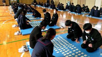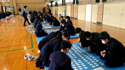 札の準備が済み、競技がスタートしました。記念すべき1首目は「藤原義孝」の歌。皆さん、目を皿のようにして、札を探しています。お手つきに注意して、お目当ての札をゲットしましょう。