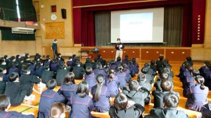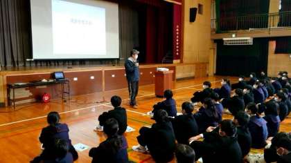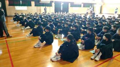 1年生の皆さんが体育館に集まり、高校進学について教わります。公立と私立の違いや、公立高校各学科の特色をまとめた冊子が配られ、進路指導主事の先生からお話がありました。受験までまだまだ時間はありますが、今すべきことを考え、行動に移す姿勢が大切です。