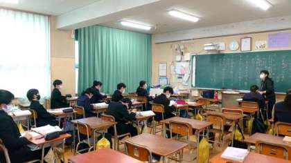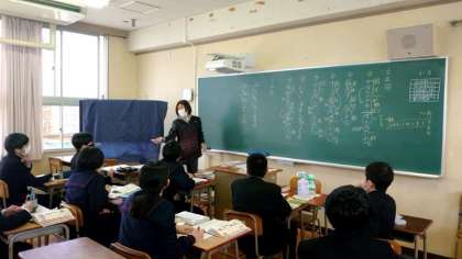 1年生国語科文法の学習で少人数授業を行っています。2つの教室に分かれて、それぞれ先生から説明を聞いています。人数が少ないと個別の質問がしやすいです。どしどし先生方に尋ねてください。