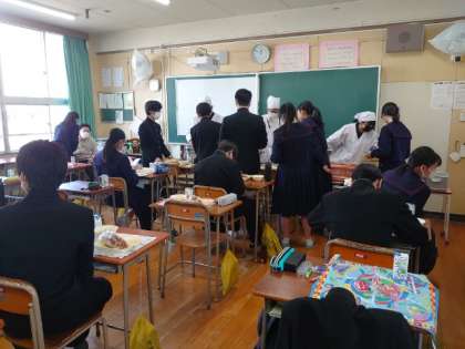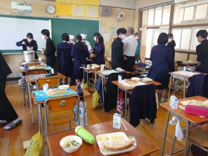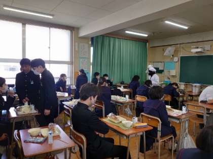 お昼のチャイムが鳴り、お待ちかねの給食です。今日のメニューは「ほうれん草のクリームシチュー」。時折雪が散る寒さの中、温かいシチューは嬉しいです。3年生の教室では配食の準備中。皆さん温まってくださいね。