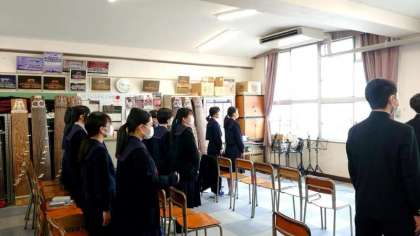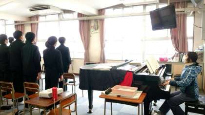 3年生音楽の授業で卒業式で歌う曲の練習が行われています。国歌・校歌を歌った後、「卒業式 別れの歌」と続きます。別れの歌は卒業生による最後の合唱。中学校を巣立つ思いを込めて、皆さんの美しいハーモニーを楽しみにしています。