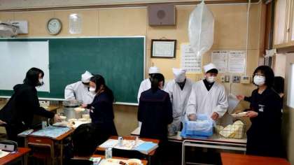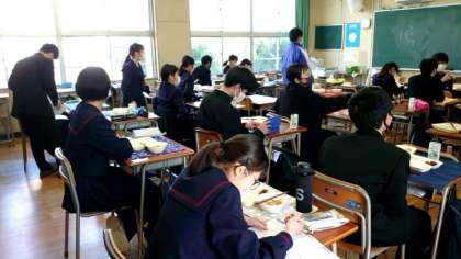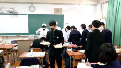 お昼休みになり、2年生の教室で給食準備が始まりました。今日は「鯨のオーロラ煮・まる天と野菜のうま煮・もやしのピリ辛あえ」の和風献立。カラッと揚げた鯨肉のお味はいかがですか?たくさんいただいて午後の授業も頑張りましょう。