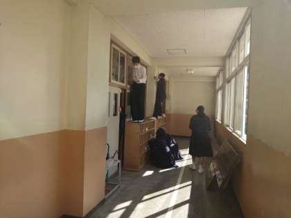 校舎2階では2年生の皆さんが清掃活動に勤しんでいます。週末の寒さがウソのように、今日は暖かな陽射しが廊下に届いています。蛇口から出る水はまだ冷たいですが、皆さん頑張っています。