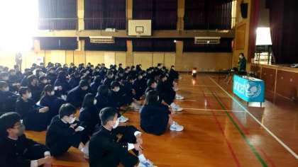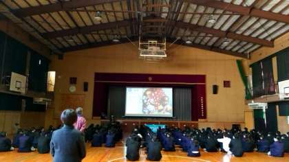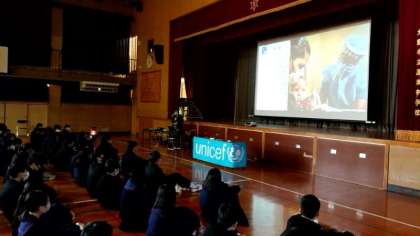 3年生の皆さんが体育館に集まり、ユニセフ(国連児童基金)の方からお話を聞いています。ユニセフは、貧困や紛争、災害などで苦しむ子どもたちの幸せ・健康な生活が送られるように活動している組織です。今日はさまざまな活動の様子を教わります。世界の子どもたちが笑顔になりますよう、私たちができることを考えましょう。