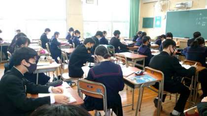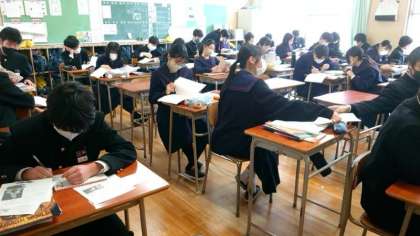 2年生の教室でも直前のテスト対策を頑張っています。美術の授業でいただいたプリントを見直す人や、互いに問題を出し合う人もいるようです。美術では実技(デッサンなど)もあるかもしれませんね。
