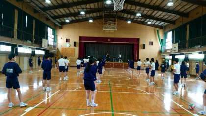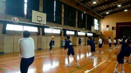 3年生体育の授業が体育館で行われています。今日は男女一緒にバレーボールを楽しみます。まずはアンダーハンドパスの練習から。パスが続くよう、優しくフワッとボールを上げている姿が微笑ましいです。