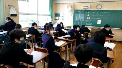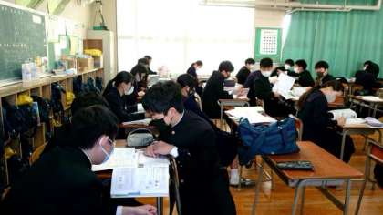 1時間目は理科のテストを行います。2年生の皆さんが、授業で配られたプリントを改めて確認中。3学期は気象に関する内容を教わりました。プリントの記述が出題されていると良いですね。