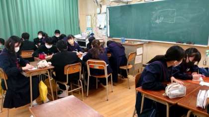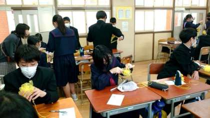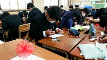 式典時に卒業生の胸に飾るリボンを1年生が作成しています。リボンには1つずつ手書きのメッセージが添えられるとのこと。先輩方への感謝の気持ちを精一杯込めながら、一所懸命に文章を考え中。ステキなプレゼントになりそうです。