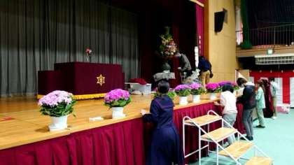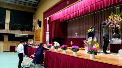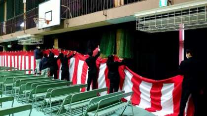 式場設営もそろそろ完了です。舞台上にはお花が、式場内には紅白幕が飾られ、式典の雰囲気が高まります。天気予報では明日は晴れ模様。最高の巣立ちの日になりそうです。