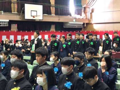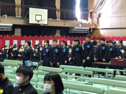 1年生手作りのリボンを胸に、卒業生が入場してきます。それぞれクラスカラーになっています。
