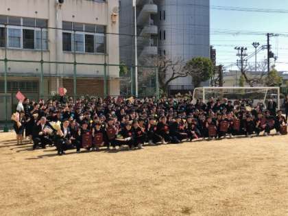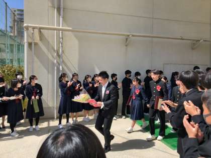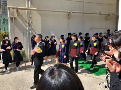 無事に式が終了し、最後の学級活動を終えた卒業生が運動場にやってきました。在校生や保護者の方々が花道を作り、拍手の中を進みます。数々の思い出ができた高津中とも今日でお別れ。71期生の前途に幸多きことを祈っています!