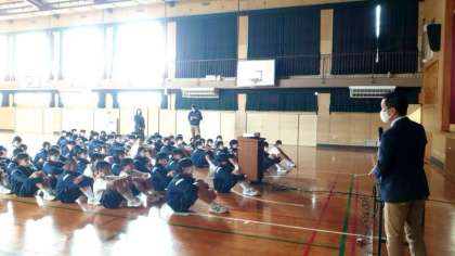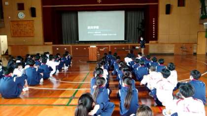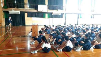 天王寺区役所、天王寺消防署に来ていただき、1年生で「防災体験学習」を行っています。体育館では区役所の防災担当講師の方から災害に対する心構えや発生時の行動について教わります。