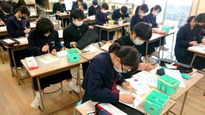1年生美術の授業で絵筆を使ったデッサンの実習中。チョキを出した自分の手をモデルに、水彩用絵筆を使ってデッサンを描きます。手や指のシワなど、細かなところもしっかりと描写しましょう。