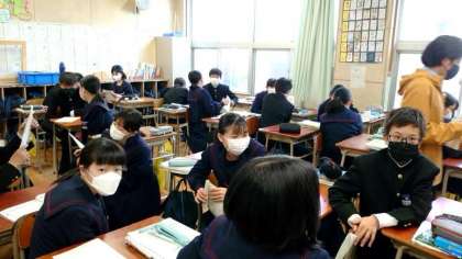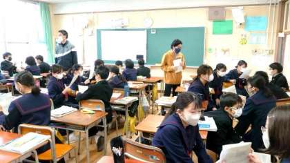1年生英語の授業で英語のスピーチを練習中。1年間を振り返り、思い出に残った出来事をお話します。C-NETのミック先生が、皆さんのスピーチをチェックしてくださいます。どんなことが思い出に残っていますか?