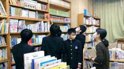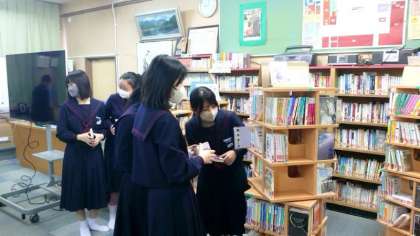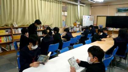 1年生国語科で図書室の利用について先生のお話を聞いています。好きな人は昼休みの開館を利用しているのですが、なかなか足が向かない人もいる模様。春休み期間の図書貸出を行っているので、ぜひ利用しましょう。