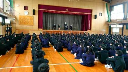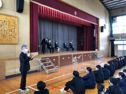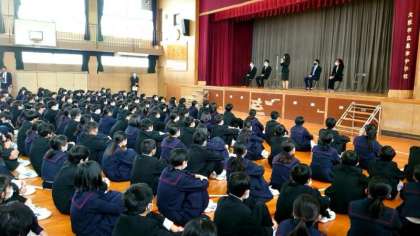 教職員、PTAとのお別れ会を行った後、離任される先生方は生徒の皆さんが待つ体育館へ。春休み中ですが、たくさん集まってくれました。卒業生や保護者の皆様も多数来校し、先生方とのお別れに駆けつけていただき、ありがとうございました。