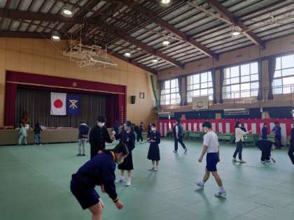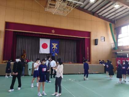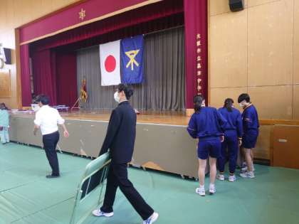 体育館フロアの保護シート敷設・張り出し舞台のセッティングが完了しました。これから長イスを並べていきます。紅白幕が張られると華やかになりますね。