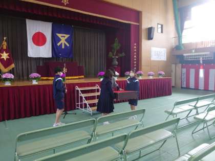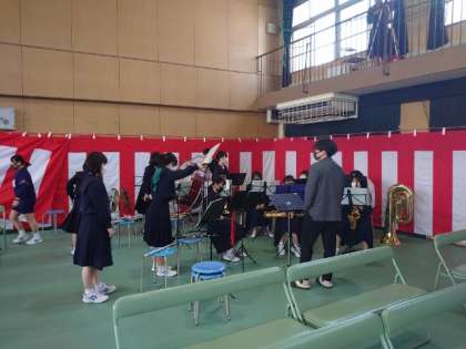 現在、放送委員・吹奏楽部の皆さんがリハーサル中。在校生が「歓迎のことば」を読み上げる時のマイク・指揮台準備を練習します。吹奏楽部の皆さんも明日の本番にむけて最終調整中。皆さん、明日もよろしくお願いいたします!