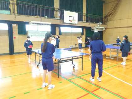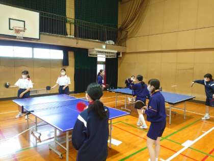 現在、体育館で卓球部の皆さんが練習中。先月行われた大会では女子の皆さんが予選リーグを勝ち進んだものの、決勝トーナメントで惜しくも敗退したとのこと。次回の試合にむけて練習に励みましょう。