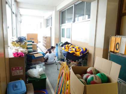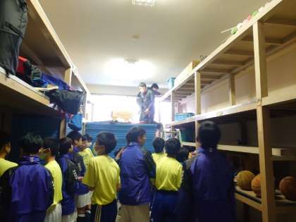 校舎3階の体育器具室のお片付けにサッカー部の皆さんがお手伝いしてくれています。バレーやバスケットボール、体育大会で使った用具など、たくさんの物品を整理します。物品を運び出すのにサッカー部の皆さんが大活躍!皆さん、ありがとうございます。