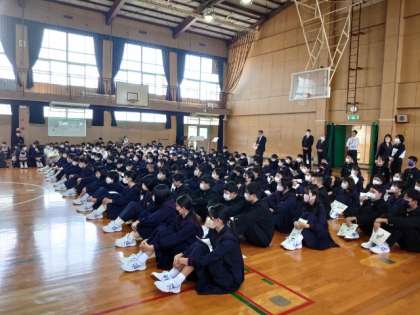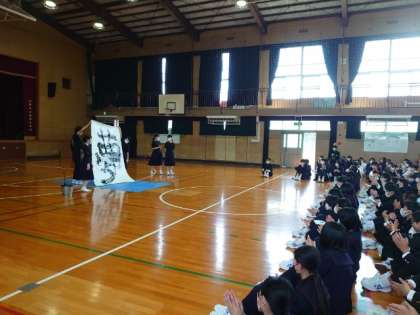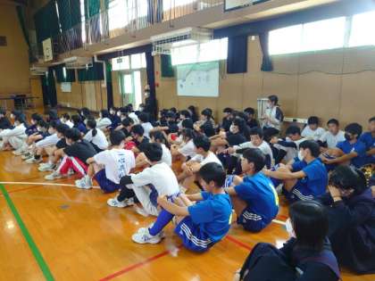 1年生の皆さんが体育館に集まり、中学校の部活動を紹介してもらいました。体育系・文化系の各クラブからパフォーマンスを交えて特色を説明します。部活動の見学は今週の木金と来週の木曜日にあります。お家の方とよく相談して、入部を考えてくださいね。
