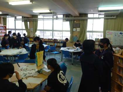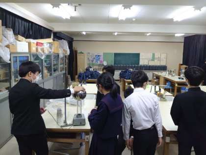 部活動見学が始まりました。図書室では文芸部と書道部が活動中。理科室では科学部が実験を披露しています。1年生の皆さんも興味深く見学しています。