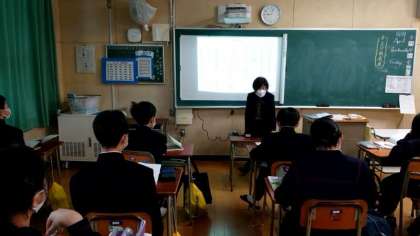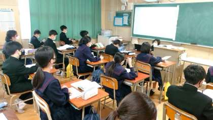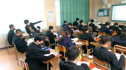 1年生国語の授業で詩人 谷川俊太郎さんの「朝のリレー」を鑑賞中。私たちを含め、世界中の人々が、かけがえのない地球で共に暮らしていることに気付かされる作品です。世界の人々のつながりを感じることができましたか?
